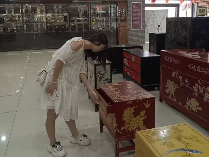 圖為團隊成員觀摩漆器家具。通訊員 何云靜 攝