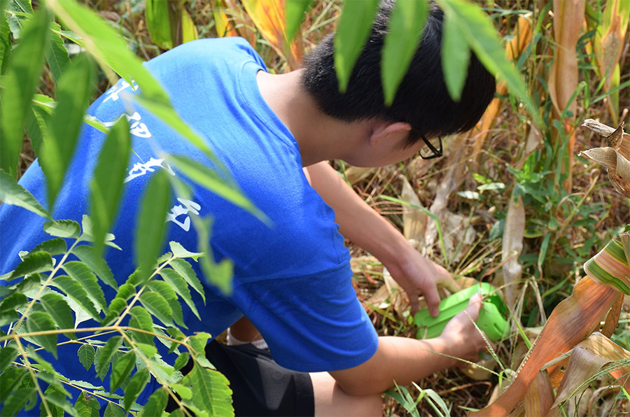 圖為團隊成員田地試用病蟲害檢測裝置  青鳥筑夢團隊供圖