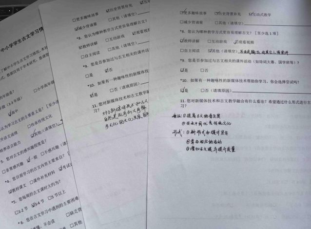 截至1月26日,團隊累計走訪泰和縣3所學校、2個社區,回收有效問卷155份,并計劃形成調研報告。團隊指導老師、廣西師范大學文學院教授肖瑜指出,調研報告將重點圍繞“情境化教學”與“跨學科融合”兩個方向展開。“讓古文從試卷走向生活,才是傳承的真正意義所在。”肖瑜表示。