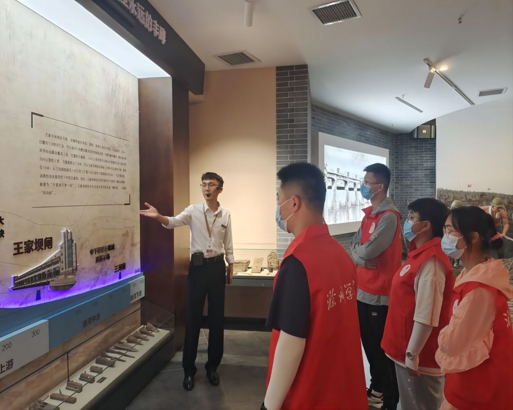 王家壩位于安徽省阜陽市阜南縣南部,南鄰淮河,與河南省的固始、淮濱兩縣隔河相望,處于淮河中上游分界處。這里不但有被譽(yù)為“千里淮河第一閘”的王家壩閘,還有庫容7.5億立方米的淮河蒙洼蓄洪區(qū)。王家壩水位被看做淮河防汛的晴雨表,在淮河防汛史上占有舉足輕重的地位。小組成員在大閘前進(jìn)行了合影,看著眼前王家壩閘,隊(duì)員們仿佛看到巨龍橫臥蓄洪庫上游,有拒水千里之勢(shì)。