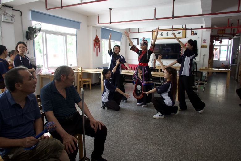 在養(yǎng)老院內(nèi),一場(chǎng)融合青春活力與畬族文化魅力的特殊舞蹈交流,成為此次實(shí)踐活動(dòng)的動(dòng)人一幕。來自畬族的實(shí)踐隊(duì)員身著傳統(tǒng)畬族服飾與其他隊(duì)員攜手,以舞姿為媒介,傳遞民族文化溫度。