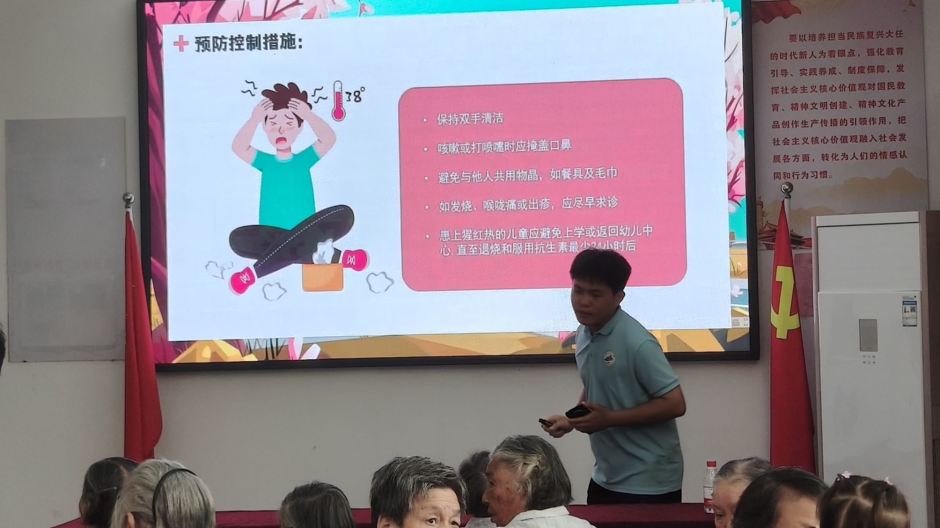 在活動開始之后,在疾病介紹方面,宣講人黃坤首先對夏季常見的一些傳染病進行了介紹,包括手足口病、登革熱,腹瀉病、猩紅熱等疾病的傳播方式,傳播媒介以及易感人群,還有各種疾病的標志性臨床表現;在疾病預防方面,不僅介紹了各種疾病的常用預防措施,還針對預防夏季傳染病進行了通用的要點總結,總結為:“勤洗手,常通風,吃熟食,喝開水,曬衣被”這個簡單易記的十五字口訣。