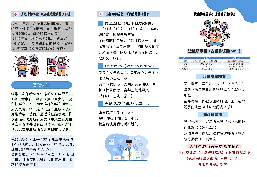 一位帶著孫子的老人翻閱手冊時眉頭緊鎖:“娃總半夜咳嗽,原來可能是哮喘?”數據顯示,我國兒童哮喘發病率十年間增長50%,華東地區高達7.57%,平均每百名兒童中約有4名患者。團隊成員隨即結合手冊內容解釋:哮喘雖無法根治,但80%以上患兒通過規范管理可實現零發作,關鍵在于早識別、早干預。