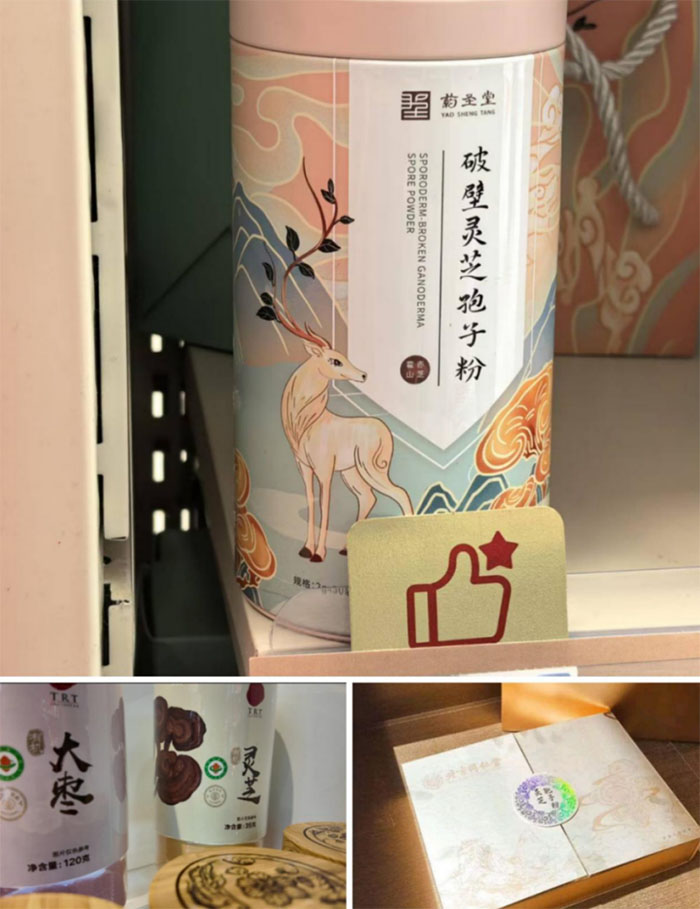 團隊成員兵分多路,分別前往不同區域的調研點。在藥店中,團隊發現售賣靈芝類產品的藥店較少,產品主要以靈芝孢子粉形式存在。在保健品店,靈芝產品的種類更為豐富,除了上述常見產品外,還有靈芝片、靈芝孢子油、靈芝膠囊等。大型超市中這些產品多被放置在保健品專區,多以靈芝孢子粉和靈芝片形式存在,與其他滋補品一同陳列。