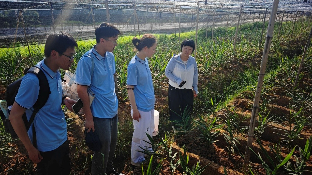 “現(xiàn)在看到的是第二次培土,前幾天剛完成,土量比第一次多不少。” 錢霞蹲下身撥開土壤,“生姜‘嬌貴’得很,喜陰怕曬,得搭遮陽網(wǎng)保證‘三分陽七分陰’,不然太陽一曬就容易蔫。” 實踐團成員們注意到,田間的遮陽網(wǎng)已撐起,陽光透過網(wǎng)眼灑在姜苗上,恰好契合其生長習性。
