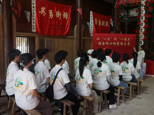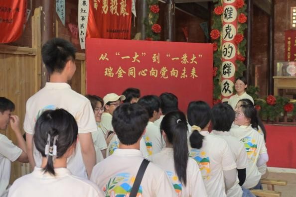 在中華蘇維埃共和國臨時中央政府會址內記錄著那段波瀾壯闊歲月的展板前,實踐團成員們久久駐足,沉浸其中。懷著對革命先烈的深切緬懷,全體成員莊嚴肅立,高舉右拳,重溫入團誓詞。鏗鏘的誓言在革命舊址中久久回蕩,這既是對先輩的崇高致敬,更是新時代青年傳承紅色基因、勇擔時代使命的青春宣言。