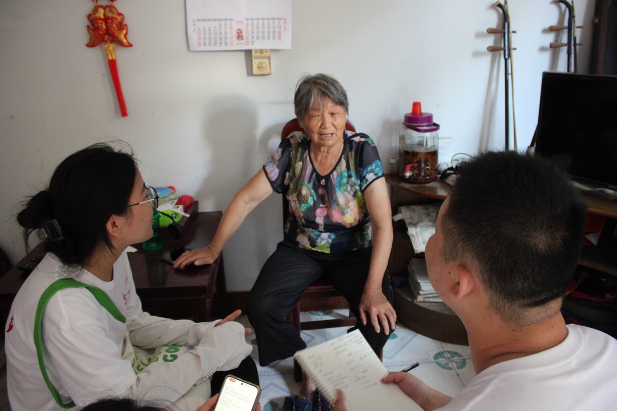 調(diào)研組首站抵達(dá)前廠村村委會,向工作人員了解當(dāng)?shù)卮彐?zhèn)基本情況,例如村落分布情況、居民務(wù)工務(wù)農(nóng)情況、特色產(chǎn)業(yè)、集體經(jīng)濟(jì)等。在掌握基礎(chǔ)信息后,成員們分成兩組展開入戶走訪,與農(nóng)村家庭面對面交流,傾聽家長對子女教育的真實(shí)期待與現(xiàn)實(shí)困境。有的老人聽力不便,成員們便耐心地俯身放慢語速重復(fù)問題,了解鄉(xiāng)村教育最真實(shí)的肌理,用青春腳步丈量鄉(xiāng)村教育的“最后一公里”。