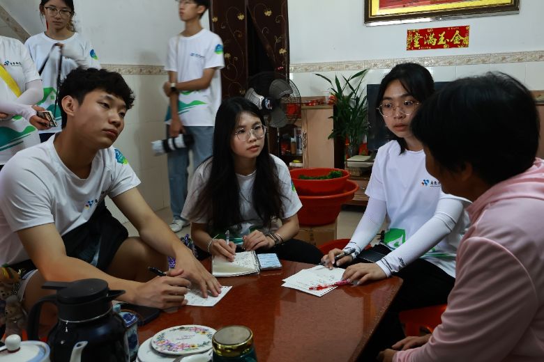 首站,來到有50年黨齡的老黨員吳界麗家。推開斑駁的木門,墻上“優秀共產黨黨員”的獎狀依舊醒目。阿婆回憶難忘故事,講述全村村民搬遷,當時沒有交通工具,就靠肩挑手扛行李,村民們安全撤離,全村人都落淚了。”隊員們邊記邊問,用攝像機錄下老人眼角的淚光,桌上的筆記本已寫滿半本。在疫情期間吳界麗也不忘自己黨員身份,協助村委做好宣傳工作,每次組織活動都帶頭參加。他們歷經風雨卻始終堅守,用“為人民服務”的誓言丈量人生,把個人理想深深鐫刻在黨和國家的事業發展中。最后吳界麗鼓勵現在大學生別懼試錯,莫負時光,讓青春在奮斗里綻放最亮的光。