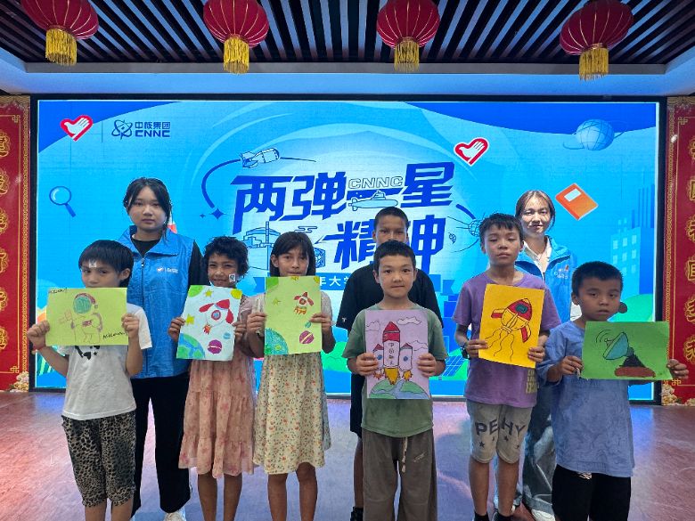 宣講結束后,實踐隊員搬出彩紙,畫筆,和孩子們圍坐在一起,用彩紙做出五顏六色的紙火箭,畫紙上畫著各式各樣的火箭,閃爍的星星。最后,孩子們舉著自己的作品排成一排,紙火箭林立,畫紙上的蘑菇云、火箭、科學家笑臉相映成趣。