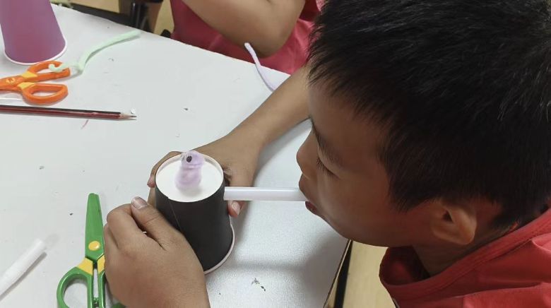 最讓孩子們興奮的,當屬 “水瓶琴”“會跳舞的蛇” 等動手實驗。分組挑戰 “水瓶琴” 實驗!孩子們往不同水瓶裝水,敲擊瓶身,調出高低不同音調,感受振動頻率與音調的關系,用普通水瓶奏響奇妙旋律,體驗創造樂趣。“會跳舞的蛇” 實驗超吸睛!按步驟操作:紙杯扎孔穿吸管,扭扭棒做小蛇放杯底,吹動吸管發聲,小蛇真的 “跳舞” 啦! 孩子們親眼見證聲音振動的力量,明白聲音能傳遞能量,在動手實踐中玩得不亦樂乎,科學思維持續拓展。