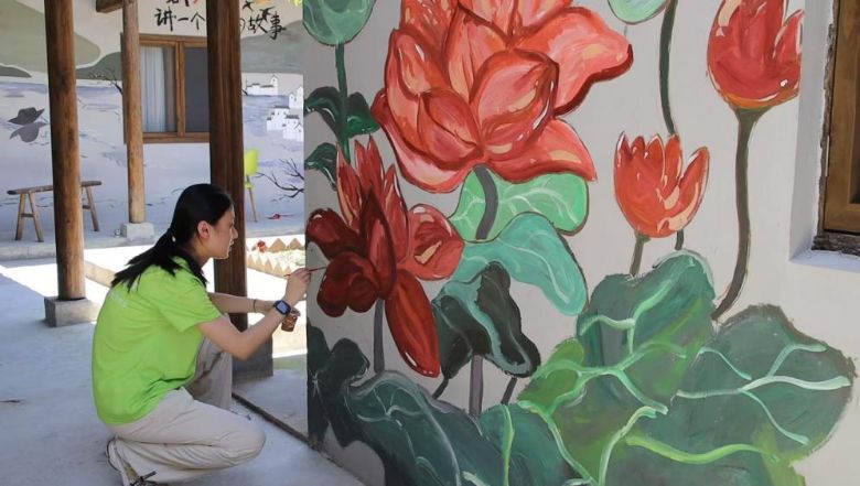 針對鄉村文化打卡點缺乏的問題,團隊成員結合專業所學,以當地板龍民俗和特色農業為靈感,設計并繪制了3幅總面積達30平方米的3D墻繪。墻繪融合了板栗、桑蠶等當地元素,既保留了馬頭墻的傳統風貌,又增添了現代藝術氣息,成為村落中一道亮麗的風景線。
