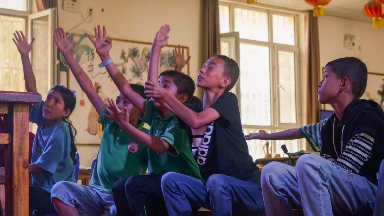 (圖為阿克蘇市友誼社區茶苑內青少年舉手搶答)