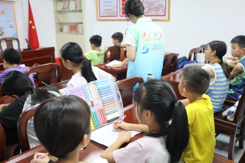 為增強(qiáng)地方文化自信,助力鄉(xiāng)村振興,7月10日,佛山大學(xué)人文學(xué)院“薪火之隊(duì)”義教組成員走進(jìn)德慶縣香山村黨群服務(wù)中心,為當(dāng)?shù)睾⒆觽儙砹艘惶贸錆M童趣與意義的繪畫課。