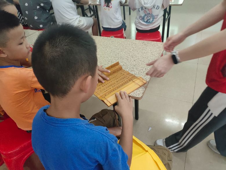 突擊隊(duì)隊(duì)員通過(guò)動(dòng)畫(huà)短片、竹簡(jiǎn)實(shí)物展示和互動(dòng)問(wèn)答,為孩子們鋪開(kāi)一幅紙張進(jìn)化的歷史長(zhǎng)卷。大家觸摸著粗糙厚重的竹簡(jiǎn),直觀感受古代“汗青”記事的不便——不僅攜帶困難,還易被蟲(chóng)蛀損壞。當(dāng)講到蔡倫改進(jìn)造紙術(shù)時(shí),隊(duì)員們?cè)敿?xì)介紹其以苧麻、稻草、竹子為原料,歷經(jīng)百余天工藝打磨,最終造出輕薄柔韌的紙張,讓書(shū)寫(xiě)從此擺脫束縛,文明傳播得以加速。孩子們紛紛感嘆:“原來(lái)一張紙里藏著這么多智慧!”
