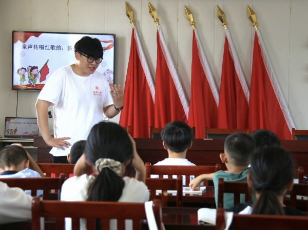 作業輔導結束后,“童聲傳紅歌韻,薪火遞愛國情”主題活動精彩上演。實踐團成員帶領孩子們學唱紅歌《有我》,悠揚激昂的旋律在活動室里久久回蕩。孩子們稚嫩的歌聲中飽含著對祖國的熱愛,愛國的種子也在這美妙的歌聲中悄然生根發芽。