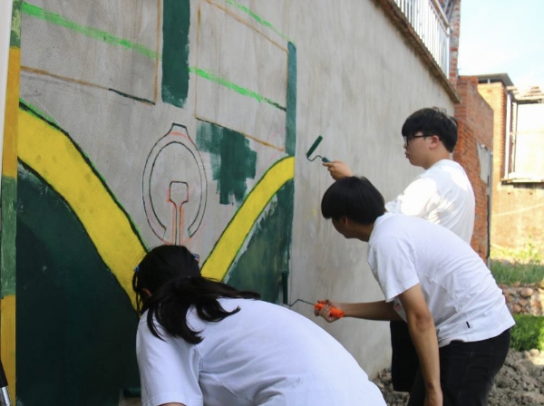 下午三點,實踐團成員稍作休整后,便全身心投入到鄉村美化行動中。隊員們手持畫筆,以墻面為畫布,繼續未完成的墻體彩繪工作。