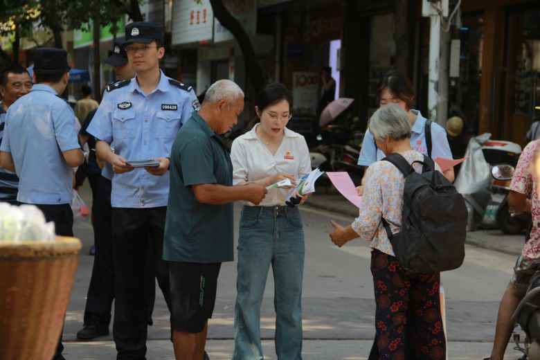 當(dāng)日上午8時,活動在人流密集的集市區(qū)域正式啟動。錦和站派出所副所長尹煒帶領(lǐng)民警趙鵬、謝子添,與懷化學(xué)院實踐團師生共同組成宣傳小組,采取流動宣講的方式開展活動。
