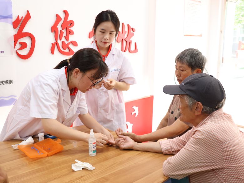 ▲圖為實踐隊員正在給老年人測量血糖。陽樂樂 供圖。