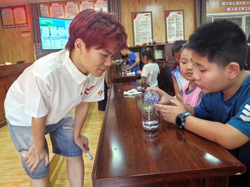 隨后開展的生態瓶制作活動中,志愿者按流程分發材料,全程關注孩子們的操作狀態,筑牢安全防線。