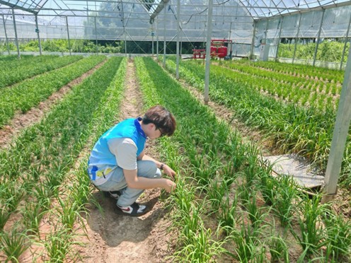 在調研過程中,團隊成員分組開展實踐活動:一組與農戶溝通,了解大棚環境監測設備,優化溫度、濕度等參數;另一組與園區管理人員進行交流,就蔬菜產業數字化轉型、智慧農業技術推廣等議題進行探討。