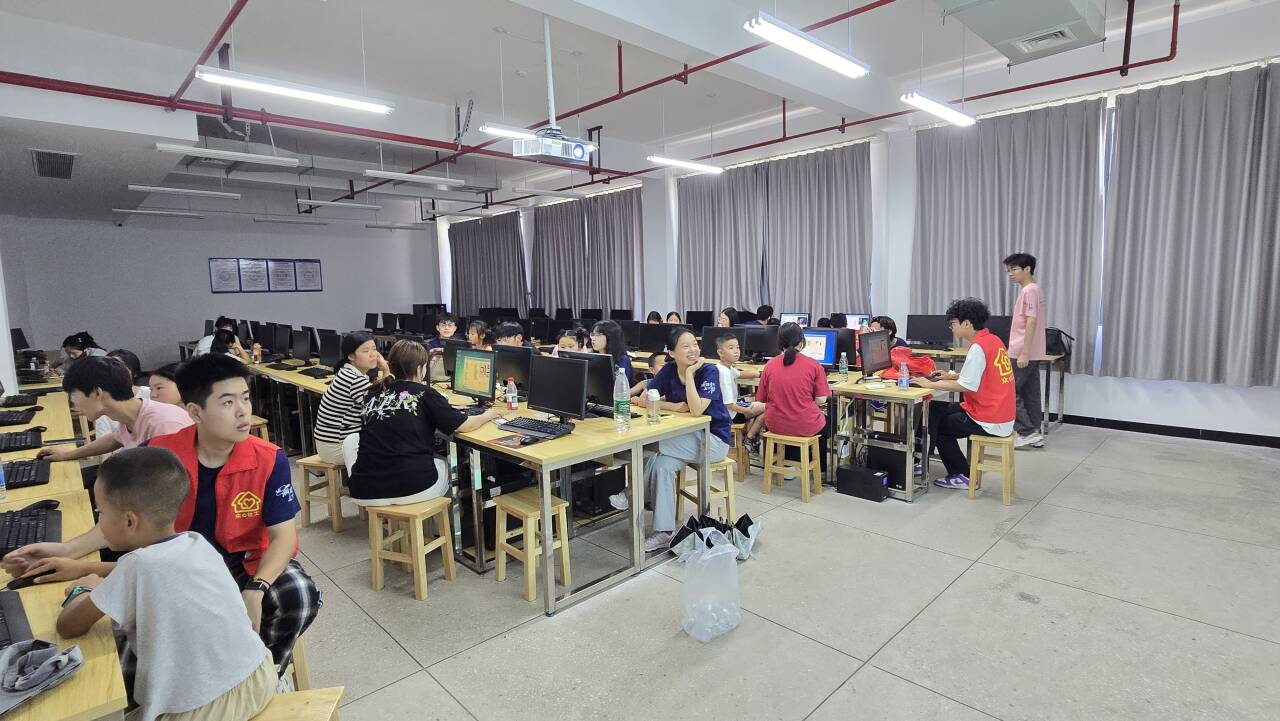 后面團隊將活動陣地延伸至學院的計算機機房。志愿者們依托高校優質資源,將機房打造為編程啟蒙的專業基地。活動伊始,志愿者以鍵盤為“指揮棒”、屏幕為“魔法畫布”的生動比喻,揭開了計算機的神秘面紗。隨后,孩子們在指導下大膽構思,將所學知識融入實踐,創作出簡易迷宮探險、會跳舞的卡通角色等互動作品。屏幕上躍動的不僅是代碼運行的結果,更是孩子們邏輯思維與無限創意碰撞出的智慧火花,探索熱情在指尖代碼中被徹底點燃。