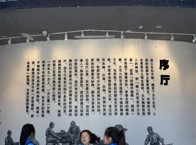實踐隊伍在見證了制胚工序的繁雜之后來到了黑砂博物館,首先映入眼簾的是序廳,展示著黑砂的悠久歷史,往里走,展墻上的文字記錄著黑砂從古到今發展的歷程,上古先民,怎樣摶土成器,怎樣成為如今的非遺黑砂。每一個字都承載著深厚的歷史底蘊。繼續前行,就是玲瑯滿目的砂制模型,讓實踐隊伍的成員們能夠切實感受到古人的生活環境與黑砂的緊密聯系,深刻體會到黑砂文化在促進經濟文化交流中的作用。