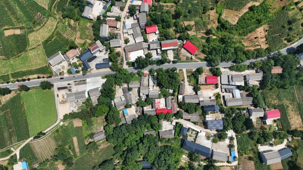借助無人機航拍設備,我們得以俯瞰整個王澗村的全貌。村落似一幅平鋪的田園織綿,錯落的房屋如散落的棋,紅頂灰墻點綴在蔥綠的綠意間,蜿蜒的道路如絲帶穿梭,鄉間的煙火和自然的意趣都被縫進這方天地。
