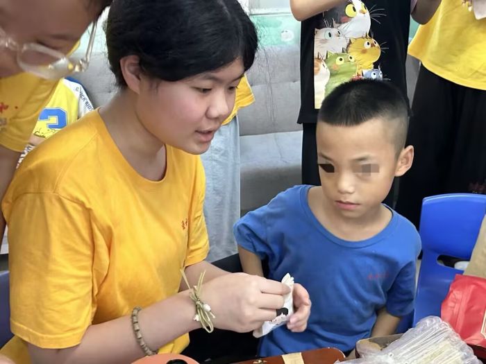 午后的手工室中,艾草、薄荷的清香悠悠散開。這是為水晶寶貝們籌備的香囊制作活動,借由挑選藥材、穿針引線,讓孩子們觸摸草本肌理、感知香氣層次,在傳統(tǒng)技藝體驗里喚醒感官。“星星的孩子”對細微觸感與氣味尤為敏感,于他們而言,志愿者俯身相伴、指尖相觸的溫度,遠比針線技法更珍貴。每一針穿梭、每一味填充,都讓布料與藥香交融成獨特的“成長印記”,把孩子們與世界輕聲交流的瞬間,妥帖收進這方香囊 。