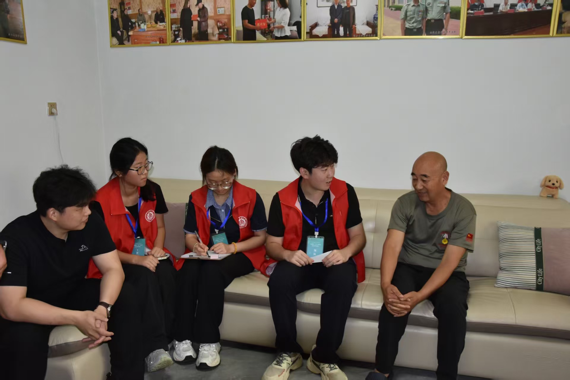 待章老情緒平復后,他繼續緩緩說道“放下戰友后,我回到了自己的陣地,從戰友的尸體下面意外翻到了兩盒罐頭,我憑著這兩盒罐頭,在高地堅守了七天七夜,殺了四十多個敵人,和我上來的戰友一死一重傷,直到最后團長向上面請示,我才最終被其他戰友保了下來”。章老講述完他驚心動魄的抗戰故事后,為團隊成員展示了他的一等功勛章以及其他的獎章。聽完章老的故事,團隊顧問劉志浩頗有感觸地對章老說到“都說現在是和平中國,可現在的和平都是章老您和您的戰友用血肉之軀為我們后代筑起來的,能有如今的和平中國,真的非常感謝您”。之后,章老還為團隊成員透露自己退伍后也一直投身在愛國主義教育的道路上,每年都會去學校為新生代講述紅色故事,宣傳紅色精神。