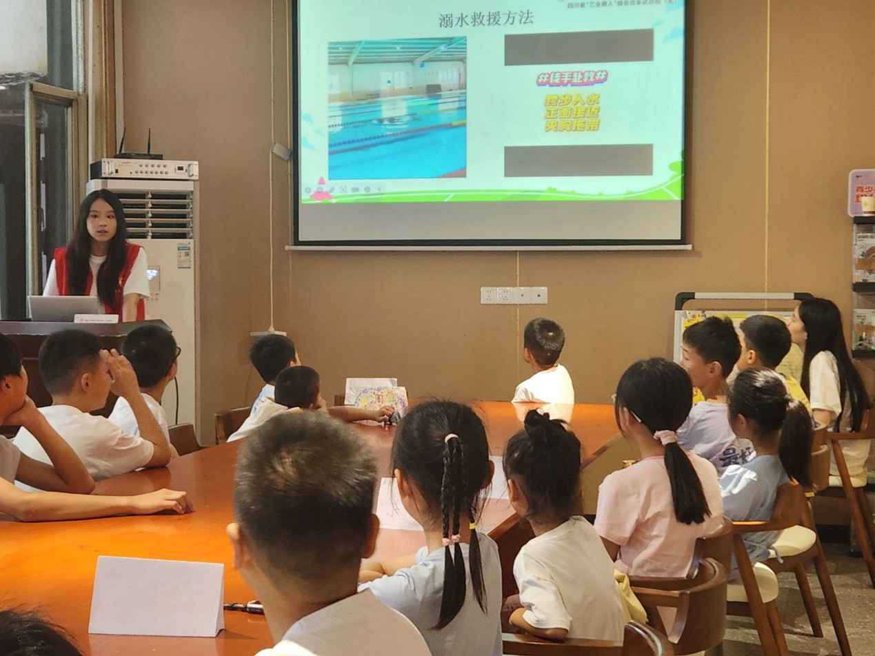 之后進行的“防溺水安全知識”環節,主講人介紹了“防溺水六不準”,即不準私自下水游泳、不準擅自與他人結伴游泳、不準在無家長或教師帶領的情況下游泳、不準到無安全設施和無救援人員的水域游泳、不準到不熟悉的水域游泳、不準不熟悉水性的學生擅自下水施救。主講人還詳細講解了溺水自救方法,如保持冷靜、仰面展平身體、扔掉沉重物品、尋找浮具或采用“水母漂”自救。在“溺水救援知識”部分,她強調發現有人溺水時,切勿盲目下水施救,應立即呼救并撥打120,利用救生器材施救,并在岸上采用正確方法進行心肺復蘇。