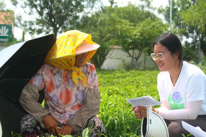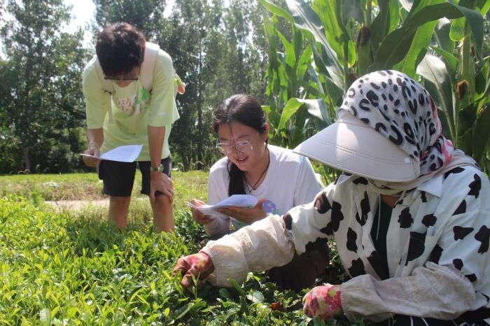 圖為社會實踐隊員詢問安家湖村村民茶葉采摘問題。袁成鑫 供圖
