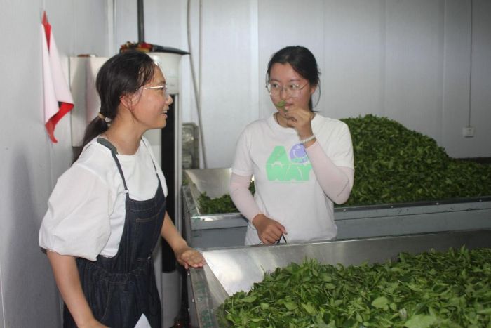 圖為實踐隊員在合作社內評估茶葉質量,了解夏季鮮茶的市場狀況。王晶 供圖