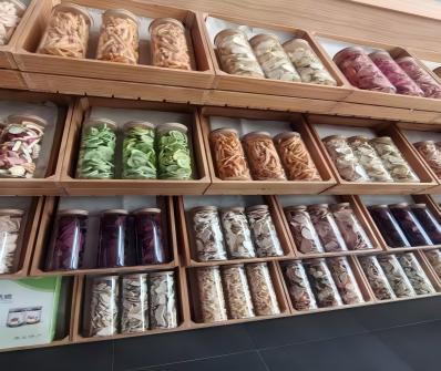 實踐團步入深加工產(chǎn)品展示區(qū),玻璃罐中的果蔬脆色澤誘人。講解員強調(diào)其獨特工藝通過了低溫油浴脫水技術制成,用的是棕櫚油,在60度低溫下脫水,營養(yǎng)物質(zhì)能保留,口感更好,避免了高溫油炸的油膩。展柜中一隅,苦蕎茶與野生菌靜靜陳列——2009年山東援建北川“維斯特”基地的高原產(chǎn)物,承載著特殊的時代記憶。