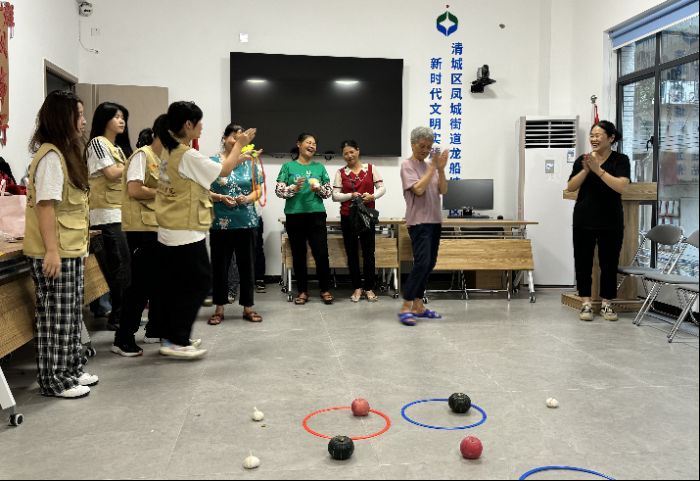 在充滿歡聲笑語的“果蔬套圈”活動現場,實踐隊員們精心為居民們打造了一場別開生面的趣味體驗。只見老人們興致勃勃地瞄準目標,手腕輕巧一拋——