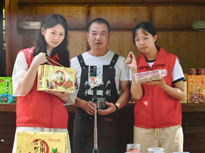 圖為筑夢團成員直播為當(dāng)?shù)靥厣朗承麄?蔣祺 攝
