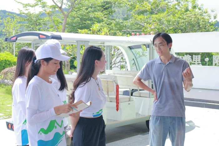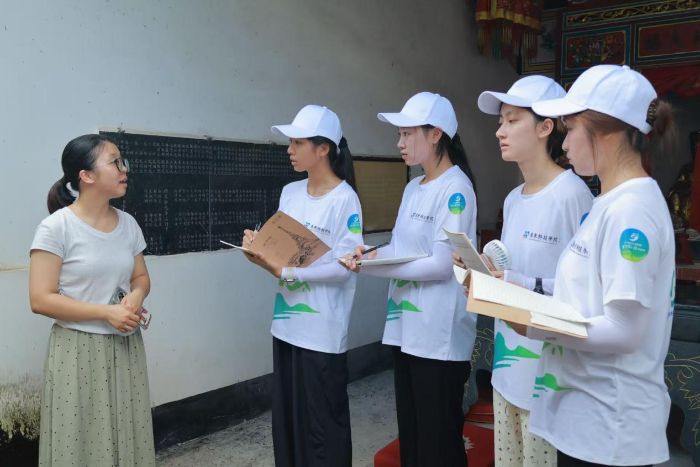 圖為大白村村委工作人員為隊員們講解譚公仙圣廟的故事(鄧瑞莊攝)