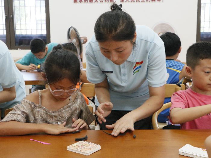 (圖為實(shí)踐團(tuán)成員指導(dǎo)小朋友幫助小朋友完成粘土作品照片。程坪攝)