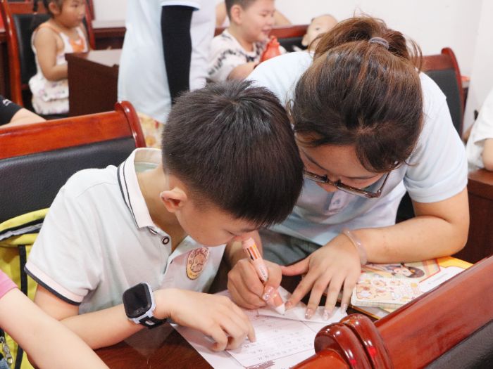(圖為實(shí)踐團(tuán)成員指導(dǎo)小朋友填寫卡片照片。程坪攝)