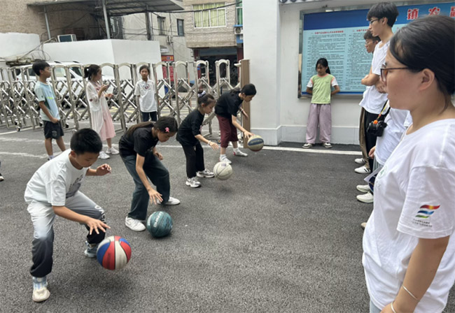 體育為基,強健學生體魄 體育課程堅守“健康第一”理念,團隊成員精心準備了多項特色體育課程:“彩帶龍”課程上,學生們攥著竹柄發力,七彩綢帶便如游龍般騰空而起;“八段錦”課程中,學生們認真模仿著“托天”“射雕”等招式,在中舒展身心;籃球課程上,孩子們縱身躍起扣籃的身影劃破陽光,進球時的吶喊與拍球的震響相撞。此外,團隊還舉辦了趣味運動會,并設立多項團體項目,不僅激發學生的運動興趣,也培養了學生的集體意識。