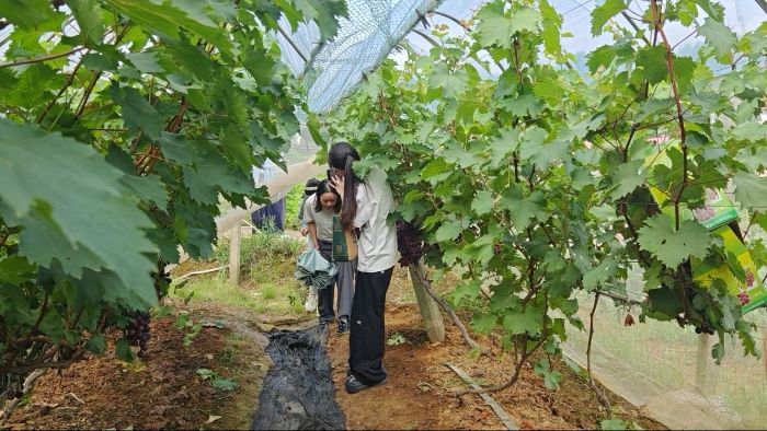 最后,我們受村民邀請去參觀了關(guān)山的葡萄園,一路上村民都熱情的招呼我們并為我們講解寧鄉(xiāng)葡萄的種植訣竅,據(jù)了解,這片葡萄園面積近千畝,品種繁多,有夏黑、巨峰、金手指、陽光玫瑰等,園中除害基本全靠人工。村民種植葡萄的手藝令我們驚嘆,正如我們從事醫(yī)學(xué)工作一樣,需要不斷在實踐中持續(xù)精進(jìn),以匠心和仁心創(chuàng)造生命的價值。