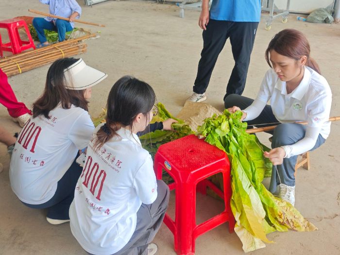 跟隨陳支書的腳步,實踐隊員們首先來到了烤煙基地,據(jù)支書講解,鎮(zhèn)內一萬多畝烤煙田分包到戶,多數(shù)家庭經營二三十畝,畝均利潤六七千,年創(chuàng)收十萬左右,為芙蓉王、白沙等品牌供應煙葉,撐起當?shù)匕l(fā)展“一片天”,在白芒營鎮(zhèn),烤煙產業(yè)早已成為鄉(xiāng)村振興的有力引擎。政府助力烤煙產業(yè)升級,投入500萬元建成半自動烤煙房。新烤房環(huán)境整潔,采用顆粒燃料節(jié)能高效,與舊設備相比優(yōu)勢顯著,大幅提升生產效率。同時,產業(yè)升級帶動就業(yè)增收,為村民拓寬增收渠道,老年人也能參與并煙工作。實踐隊員親身體驗并煙工作后,深感勞作不易。在烤煙收獲后,村民們會農歷七月前搶插水稻,既增加收入,也是避免煙草損壞的智慧之舉。白芒營人憑借勤勞,在烤煙產業(yè)與農耕的接力中,鋪就鄉(xiāng)村振興之路,繪就產業(yè)興、百姓富的美好畫卷。
