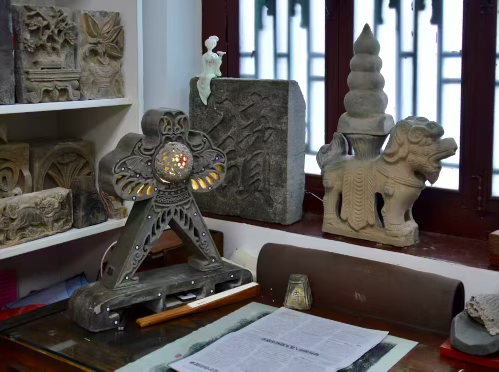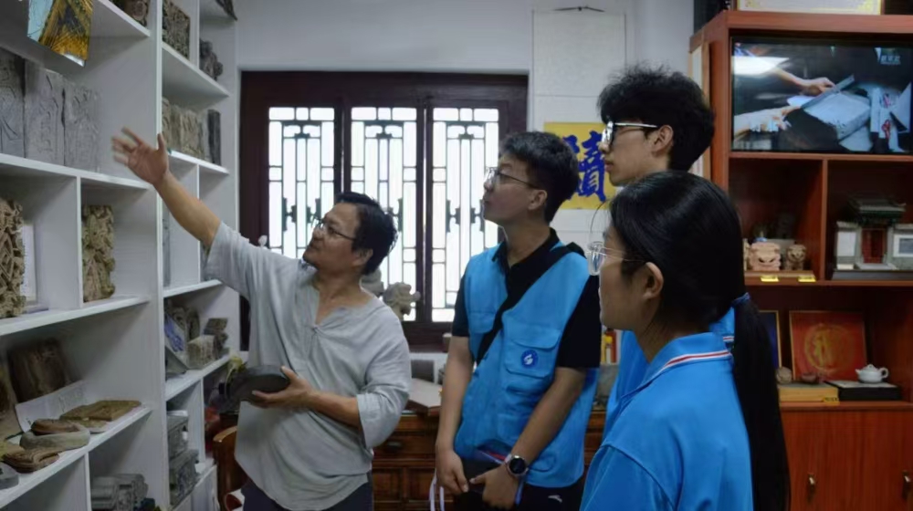 隨后,團隊拜訪了非遺傳承人神芳喬師傅。作為濰系磚雕第八代傳人,他堅持 “實用與美觀相結合” 的理念,創作的《濰縣十景磚雕香薰系列》等作品屢獲國家及省市獎項,為磚雕傳承創新貢獻力量。在本次活動中,神芳喬師傅談到,濰縣磚雕歷史悠久、工藝獨特:選用臨清磚或臨朐貢磚,古磚取自地下 70 公分黏土,富含礦物質,燒制后耐用,而現代磚易脆斷;運用線雕、浮雕、鏤空等多種技法,其中鏤空和套環工藝難度極大,一件作品需半個月以上,精品耗時更久;與山西磚雕 “先泥塑后燒制” 不同,濰坊磚雕 “先燒后雕”,作品不易變形開裂。他還科普,老磚經風雨侵蝕形成的氧化鐵層呈自然青色,是判斷年代的依據,如民國磚無明顯氧化層,清晚期與民國磚顏色有別,年代差距通常不超百年。同時,他提及傳承困境 —— 學習的年輕人較少,讓隊員們深感非遺傳承的緊迫性。