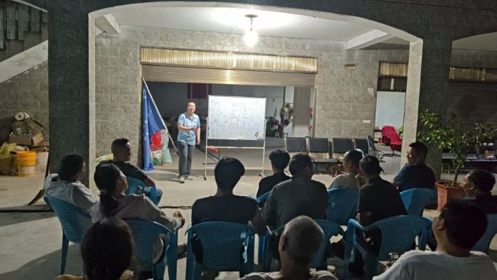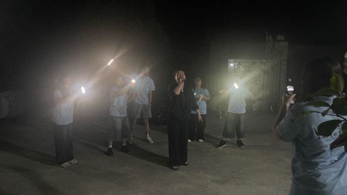 課堂的“星光”布景:沒有現成的教室,小院子就是天然課堂。組長們拿凳子,細心擦拭干凈。最費心思的是教學用具。沒有投影儀,沒有多媒體,只有一個臨時的小黑板。為了讓拼音更直觀,他們甚至在卡片上畫上夸張的嘴巴形狀示意圖,標注發音要點。調試好攜帶的藍牙音箱和話筒,確保聲音能清晰覆蓋整個場地。