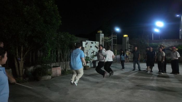 跳繩比賽將氣氛推向高潮。長長的麻繩甩動起來,“啪啪”地敲打著地面。孩子們身輕如燕,一口氣能跳幾十個,用普通話大聲數著“1!2!3!……”。幾位大叔也來了興致,笨拙卻努力地嘗試,跳得氣喘吁吁,數數聲引來善意的哄笑和鼓勵的掌聲。整個小廣場沸騰了,笑聲、歡呼聲、數數聲、歌聲、繩子的甩動聲交織在一起,匯成安山村這個夏夜最動人的交響曲。